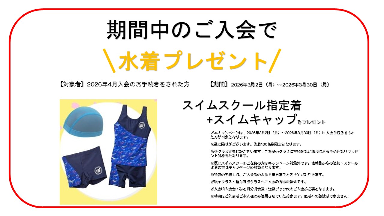 ※水着プレゼントキャンペーンは先着100名限定(入会手続き時点)となります。
