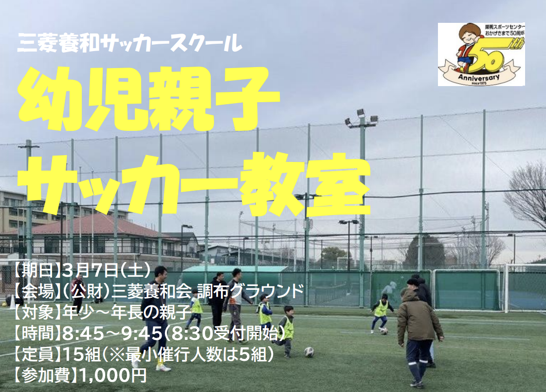 三菱養和調布サッカースクールでは、3月7日(土)公益財団法人三菱養和会調布グラウンドにて親子サッカー教室を開催いたします。