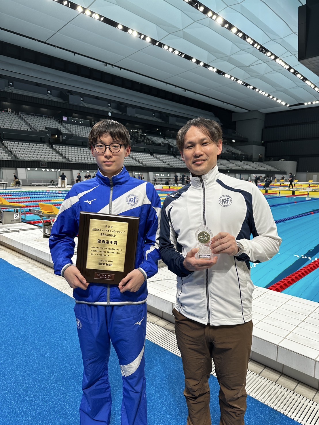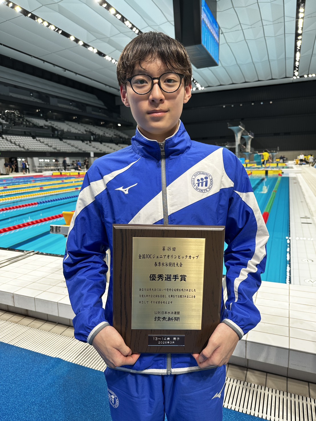 3月27日〜30日で開催されました全国JOCジュニアオリンピック春季水泳競技大会で男子13〜14歳 優秀選手に近藤 俊太選手が選ばれ、その育成コーチとして長谷川 伸ヘッドコーチが表彰されました!